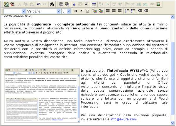In particolare, l'interfaccia WYSIWYG (What you see is what you get - Quello che vedi è quello che ottieni), che fa uso di oggetti e strumenti familiari agli utenti dei pacchetti di Office Automation, consente di migliorare l'impatto visivo della vostra comunicazione aziendale senza richiedere competenze specifiche: chiunque sappia scrivere una lettera con un programma di Word Processing. sarà in grado di utilizzare tale interfaccia.